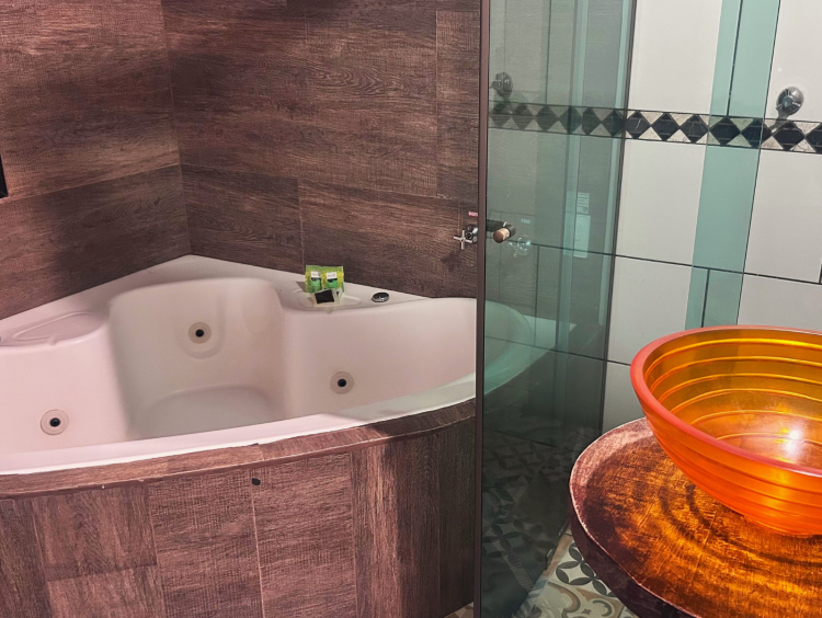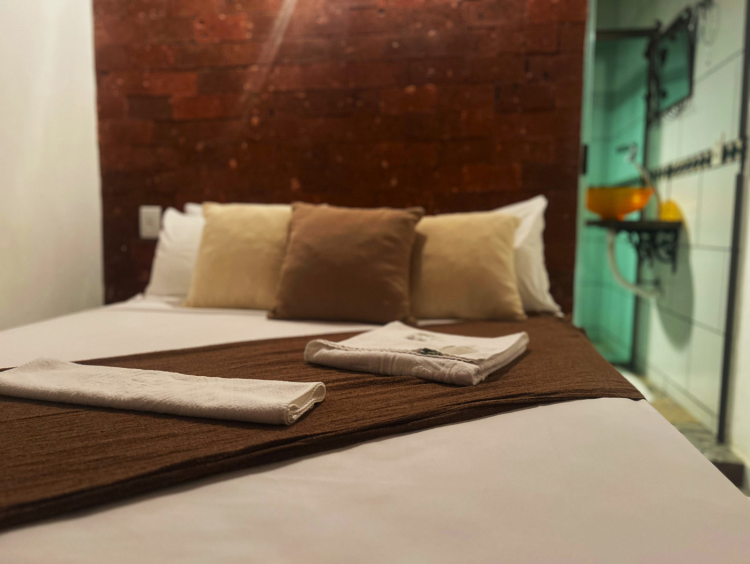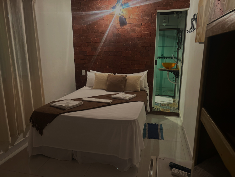 Linda suíte, compacta, andar superior, bem montada e decorada, , composta por banheira de hidromassagem para 1 pessoa, ar condicionado, Tv LCD, cama box de casal e frigobar. Não hospedamos crianças nesta acomodação